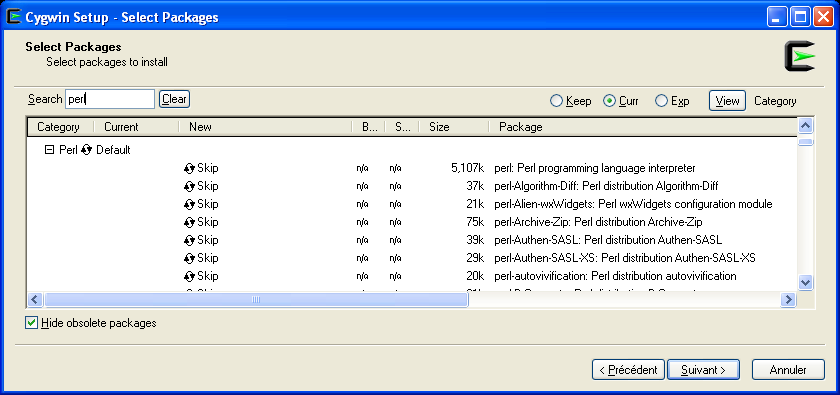 First, launch the cygwin setup program. Type "perl" in the search box and expand the Perl category: