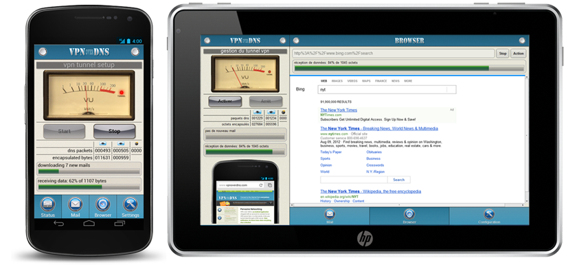 - using the native Mail User Agent integrated with VPN-over-DNS. It is optimized for speed and integrated with the following four major mailbox providers: GMail from Google, HotMail/Live from Microsoft, Yahoo! Mail from Yahoo! and FastMail from Opera. Limited to your 20 last new mails. Each mail content is limited to its text part only, truncated to 64 kilo bytes max. MIME attachments and HTML MIME parts inside mails are removed. The subject length is truncated to 4 kilo bytes max. The headers are removed, except for "From", "To", "Cc", "Date" and "Subject" headers. At the moment you check your mails, the server farm connects to your mailbox provider through IMAPs ou POP3s and downloads up to 20 new mails. When the download is complete, your new mails are stored in a cloud database and sent to your mobile device through our specific protocol on top of DNS queries. In case of a network outage while mails are sent back to your device, mails stored on the cloud database will be sent next time you set up the tunnel.