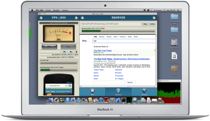 The VPN-over-DNS Value Pack adds to our leading VPN-over-DNS Android client application a pack of two VPN clients for Windows and Mac OS X. It allows to connect your favorite laptop to our VPN tunnel farm and thus benefit from our cloud services.